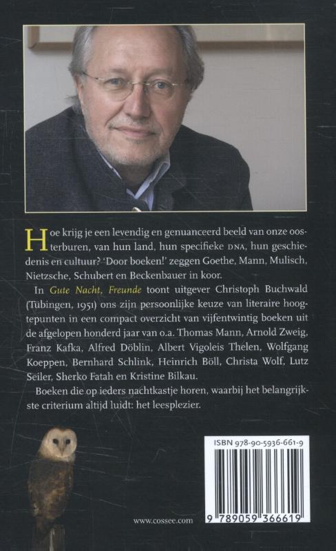 Het lezen van de Boekenweek-brochure Gute Nacht, Freunde duurt iets langer dan de sigaret van Reinhard Mey. Christoph Buchwald geeft een korte en compacte inleiding op vooraanstaande Duitse boeken die op ieders nachtkastje horen. Boeken die een idee geven van de buren, van hun land, geschiedenis, mentaliteit en van de verschillen in onze kijk op de wereld. Een belangrijk criterium is daarbij: het leesplezier.